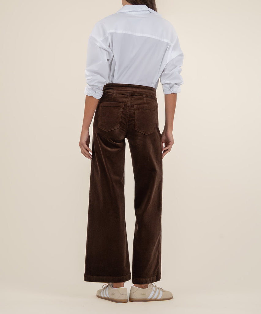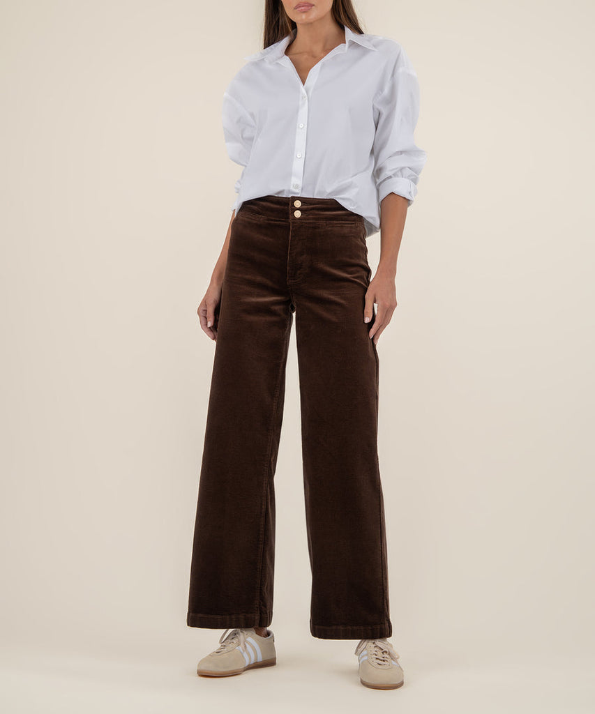 - Stay comfortable and chic in these wide leg corduroy pant in a warm fudge color. Featuring welt pockets and a wide waistband with double buttons, plus a touch of stretch for flexibility, they offer a perfect blend of style and ease. Ideal for adding texture and warmth to your fall wardrobe.