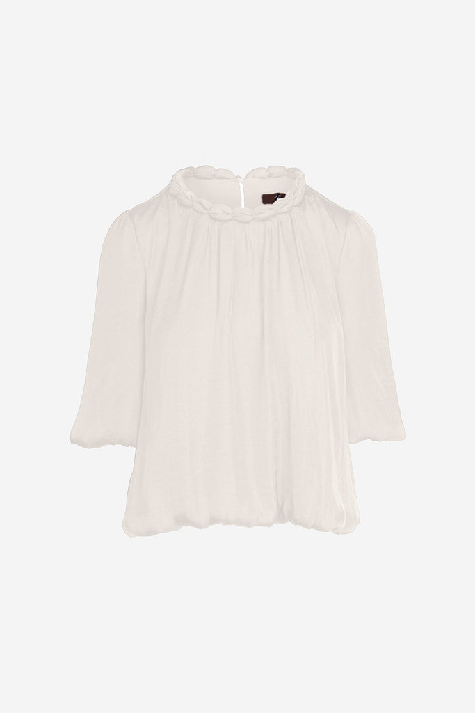 ╴½ sleeve with bubble hem and back keyhole closure for subtle dimension.