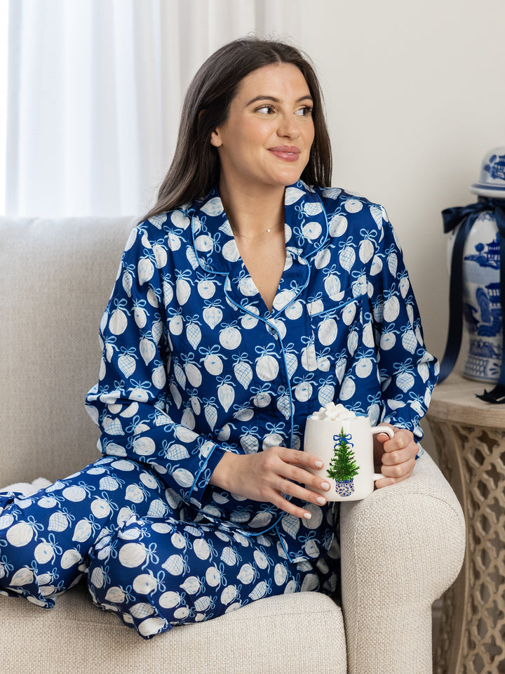 Perfect for sipping cocoa by the tree or enjoying Christmas morning in comfort, this pajama set brings festive elegance to every moment. Featuring a button-front top with a classic collar and straight-leg pants with an adjustable drawstring, our Charlotte Satin Pajama Set combines timeless style with all-day comfort.
