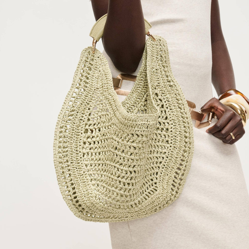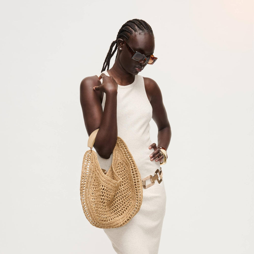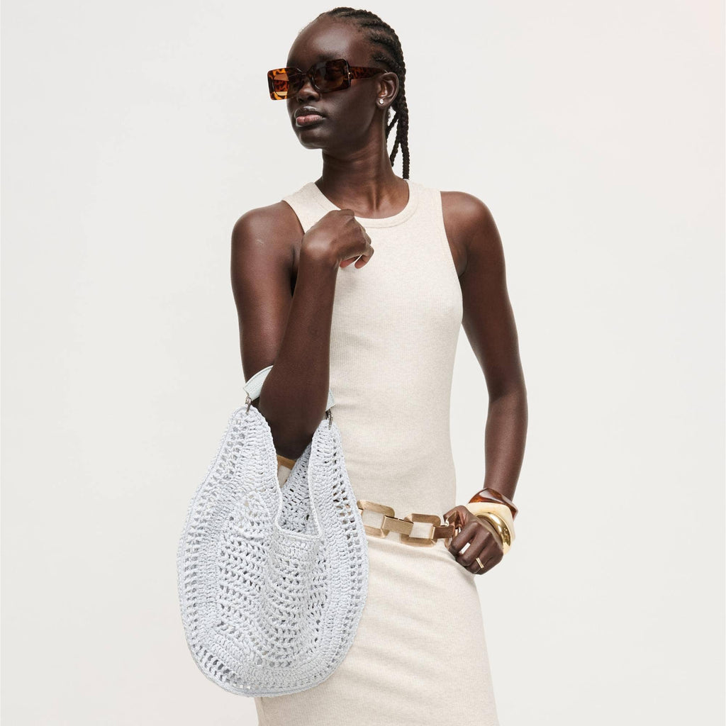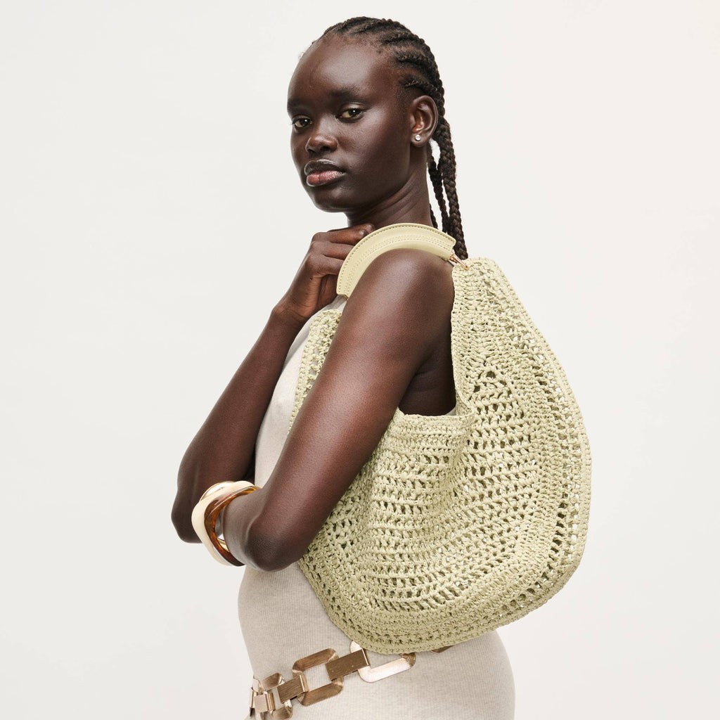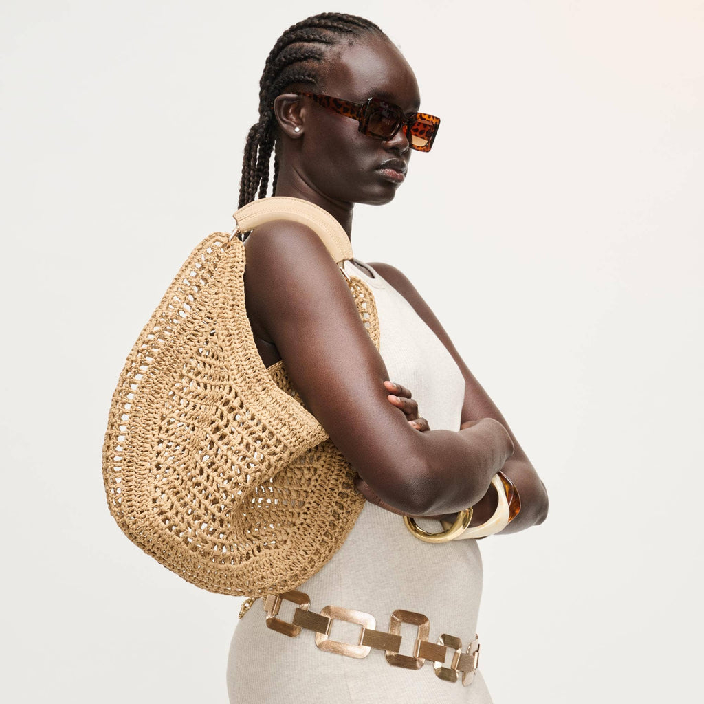 Slouchy, roomy interior holds daily essentials, while the breathable weave keeps the silhouette light and elegant. Curved, cushioned handle and subtle hardware deliver comfortable, modern polish. Ideal for trend-aware, ethically minded wardrobes that favor versatile day-to-night pieces. Wear by hand or tuck under the arm for effortless shape.