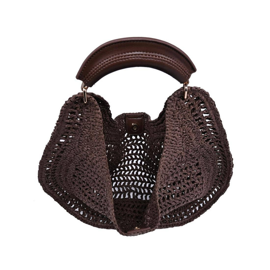 *Exterior Details: hand-crocheted open weave body offers breathability and a relaxed slouch silhouette, with a padded leather top handle and metal hardware attachments.