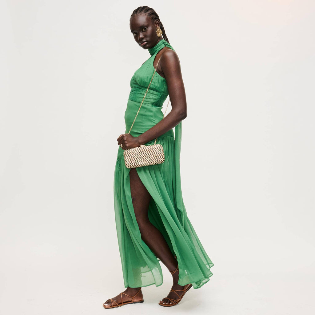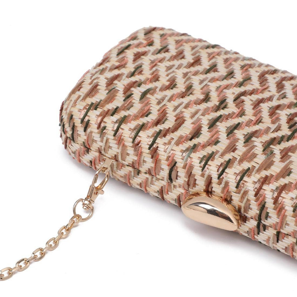 *Exterior Details: woven exterior over a structured rectangular frame provides shape and a low-profile silhouette, with a slim gold-tone chain strap for hands-free wear.