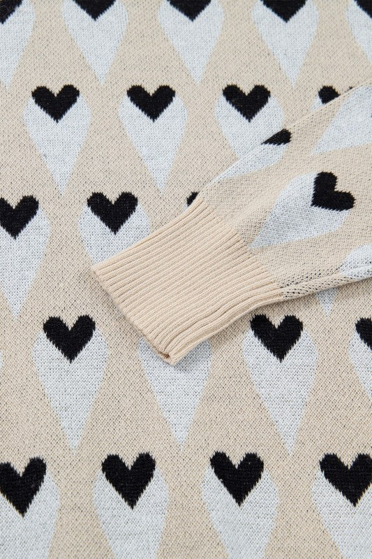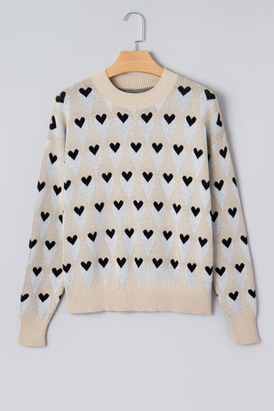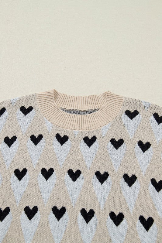 Wear your heart on your sleeve literally! This parchment sweater features a playful geometric heart pattern that brings personality to your everyday rotation. The relaxed, loose fit wraps you in all-day comfort, while soft, breathable knit keeps you cozy without the bulk. Ribbed trim details add just enough structure to keep things polished. Perfect for casual vibes that still feel put-together. 100% Cotton