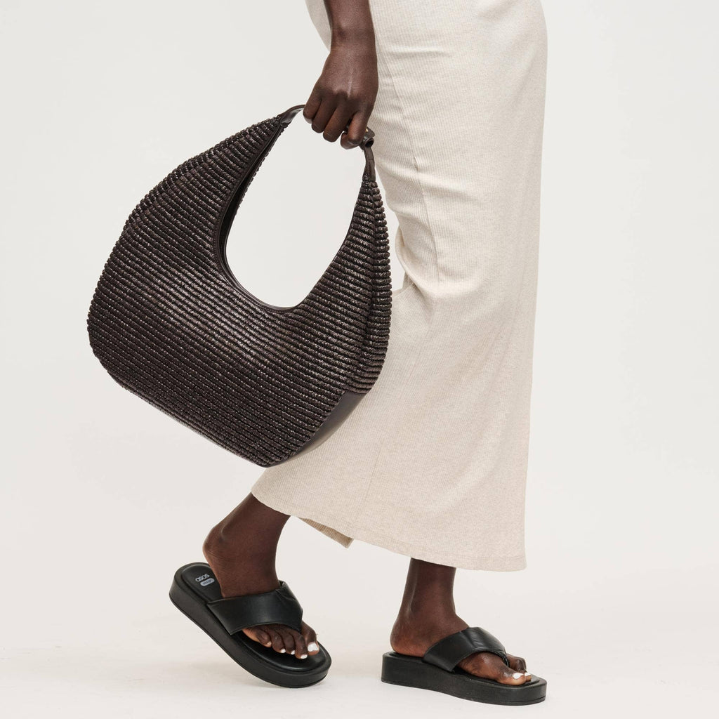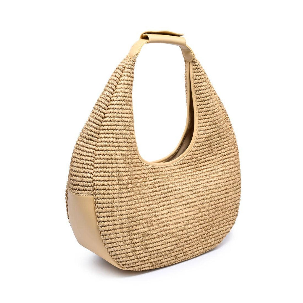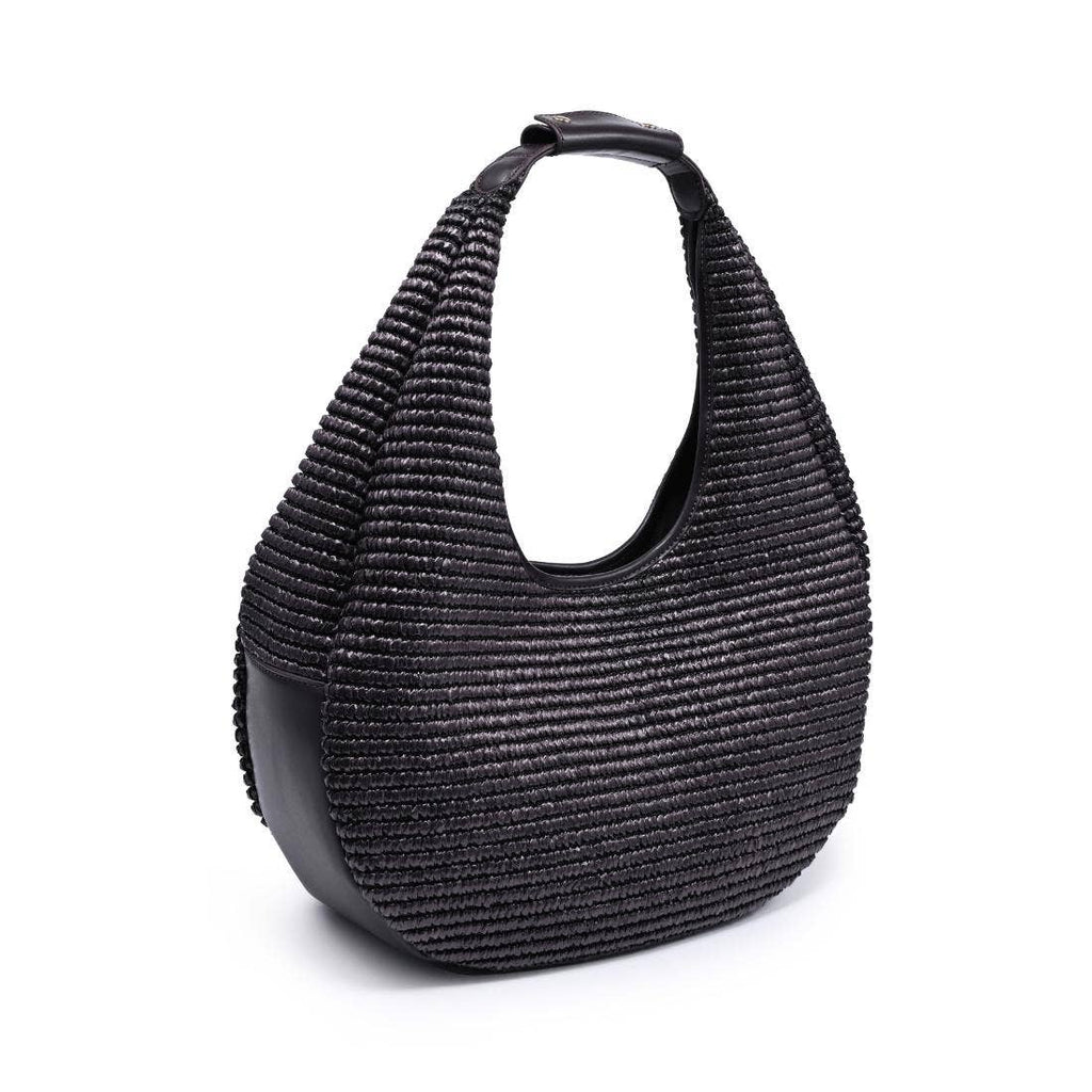 Textured woven body and a curved silhouette create a polished, contemporary profile. Padded top handle and structured base offer comfortable shoulder carry and enduring shape, while the neat opening keeps essentials accessible.